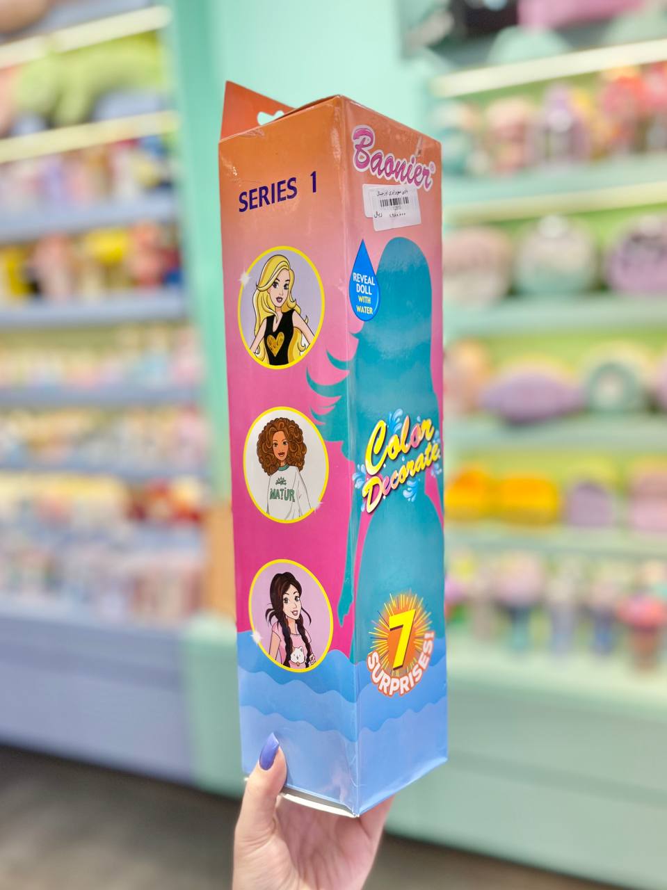 عروسک باربی سورپرایزی و شانسی که برای رفتن رنگ های روی باربی و نمایان شدن چهره ی اصلی باربی باید آن را داخل آب گذاشت کیفیت و رنگبندی و بسته بندی محصول و قابل قبول می باشد این محصول داخل یک استوانه جمع بندی شده است و بعد داخل جعبه قرار داده شده است تمام قطعات از جمله لباس و خود عروسک داخل نایلون و کاملا پوشیده می باشند