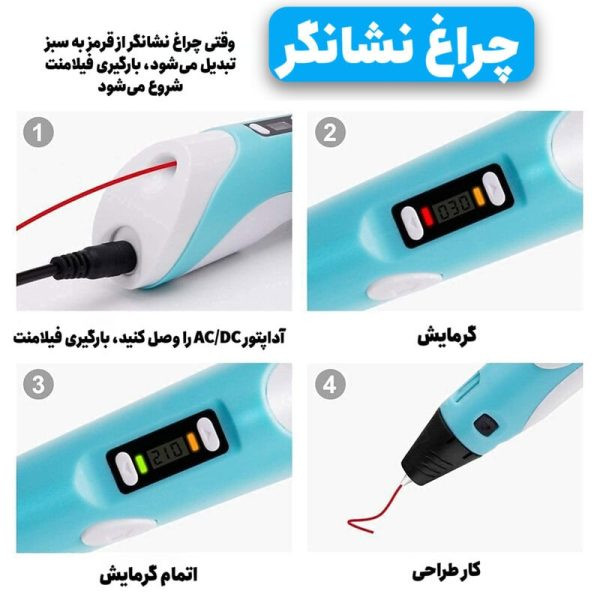 قلم سهبعدی + ۳ عدد فیلامنت رنگی + پایه نگهدارنده + سیم USB + دفترچه راهنما