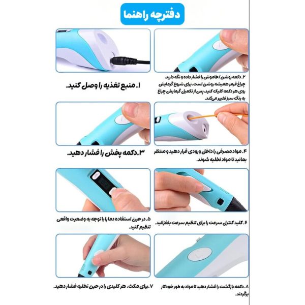 قلم سهبعدی + ۳ عدد فیلامنت رنگی + پایه نگهدارنده + سیم USB + دفترچه راهنما