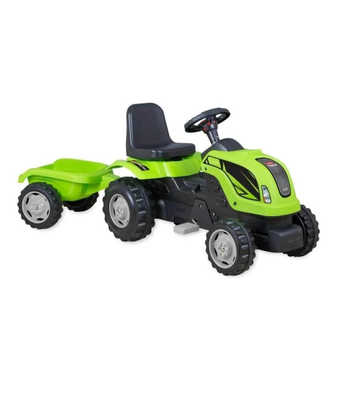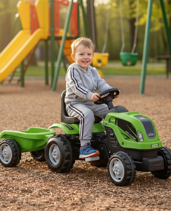 این تراکتور با تریلر متصل برای حمل بارهای کوچک طراحی شده و مناسب کودکان بالای ۲ سال است. 👶💚